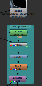Used noise and animate the frequency to create the smudge. I rotated the window and added noise to make it look like there was glass. Using noise to mask the roto and animate the frequency to create the smudge.